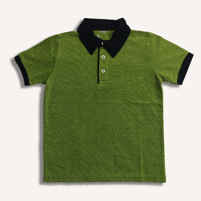 A stylish short-sleeve polo shirt in vibrant green with a contrasting black collar, perfect for casual outings or sporty activities.